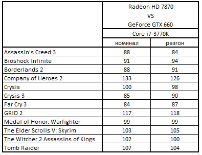 Сводная таблица производительности Radeon HD 7870 2048 Мбайт (Core i7-3770K) и GeForce GTX 660 2048 Мбайт (Core i7-3770K), где за 100% взят результат GeForce GTX 660 2048 Мбайт (Core i7-3770K)