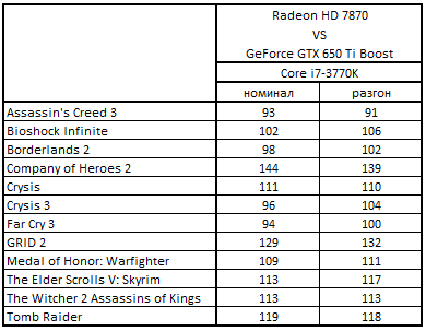 Сводная таблица производительности Radeon HD 7870 2048 Мбайт (Core i7-3770K) и GeForce GTX 650 Ti Boost 2048 Мбайт (Core i7-3770K), где за 100% взят результат GeForce GTX 650 Ti Boost 2048 Мбайт (Core i7-3770K)