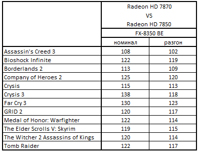 Сводная таблица производительности Radeon HD 7870 2048 Мбайт (FX-8350 BE) и Radeon HD 7850 2048 Мбайт (FX-8350 BE), где за 100% взят результат Radeon HD 7850 2048 Мбайт (FX-8350 BE)