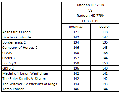 Сводная таблица производительности Radeon HD 7870 2048 Мбайт (FX-8350 BE) и Radeon HD 7790 2048 Мбайт (FX-8350 BE), где за 100% взят результат Radeon HD 7790 2048 Мбайт (FX-8350 BE)