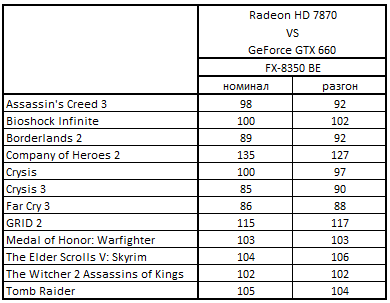 Сводная таблица производительности Radeon HD 7870 2048 Мбайт (FX-8350 BE) и GeForce GTX 660 2048 Мбайт (FX-8350 BE), где за 100% взят результат GeForce GTX 660 2048 Мбайт (FX-8350 BE)