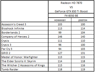 Сводная таблица производительности Radeon HD 7870 2048 Мбайт (FX-8350 BE) и GeForce GTX 650 Ti Boost 2048 Мбайт (FX-8350 BE), где за 100% взят результат GeForce GTX 650 Ti Boost 2048 Мбайт (FX-8350 BE)