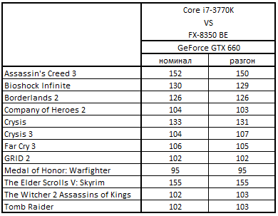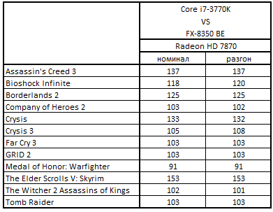 Сводная таблица производительности Core i7-3770K (Radeon HD 7870 2048 Мбайт) и FX-8350 BE (GeForce GTX 660 2048 Мбайт), где за 100% взят результат FX-8350 BE (GeForce GTX 660 2048 Мбайт)