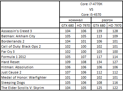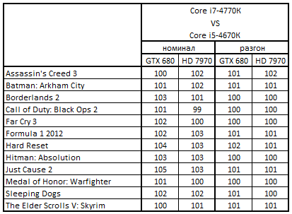 Сводная таблица производительности Core i7-4770К и Core i5-3570К, где за 100% взят результат Core i5-3570К