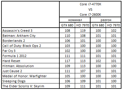 Сводная таблица производительности Core i7-4770К и Core i7-2600K, где за 100% взят результат Core i7-2600K