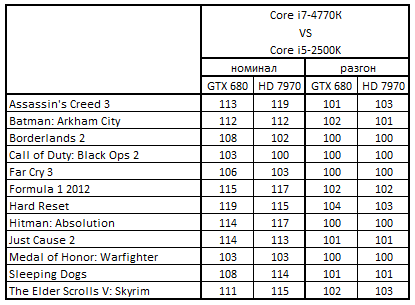 Сводная таблица производительности Core i7-4770К и Core i5-2500K, где за 100% взят результат Core i5-2500K