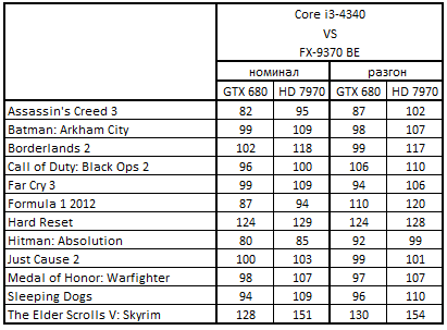 Сводная таблица производительности Core i7-4770К и FX-9370 BE, где за 100% взят результат FX-9370 BE