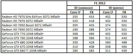 По результатам тестирования самой быстрой видеокартой во всех режимах работы стала GeForce GTX 770 2048 Мбайт. Второе место в номинальном режиме разделили Radeon HD 7970 GHz Edition 3072 Мбайт и GeForce GTX 680 2048 Мбайт, однако после разгона вперед выходит последний ускоритель. И наконец, в зависимости от режима работы, борьбу за третью строчку вели два представителя AMD: Radeon HD 7970 GHz Edition 3072 Мбайт и Radeon HD 7970 3072 Мбайт.