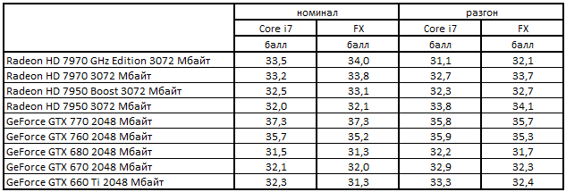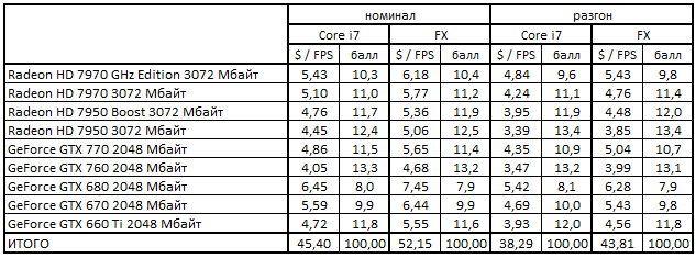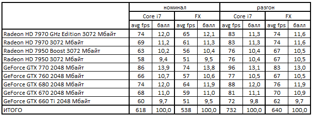 Таблица расчета баллов на основе среднегеометрической производительности систем в двенадцати играх (средний FPS)