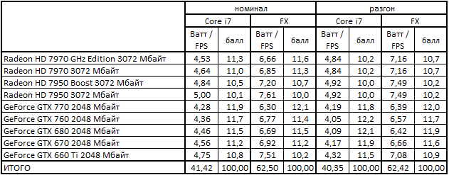 Таблица расчета баллов на основе соотношения «энергопотребление/производительность» систем (Вт/средний FPS)