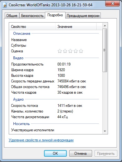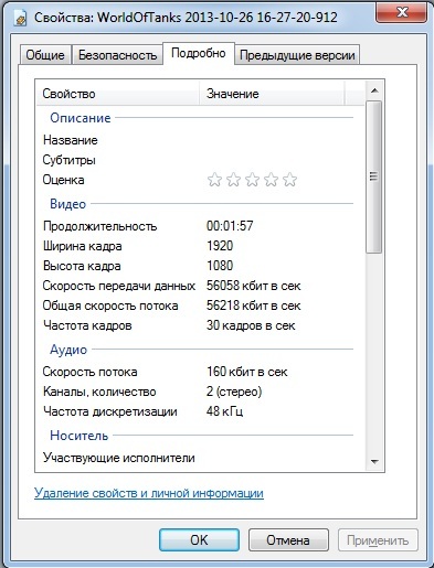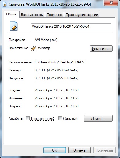 Необходимо отметить и разный размер записываемых файлов. Возьмем для примера реплей боя на карте Мурованка. При использовании утилиты FRAPS было получено два файла размером 3.95 Гбайт и 1.77 Гбайт соответственно. Свойства записанных роликов приведены на скриншотах ниже.