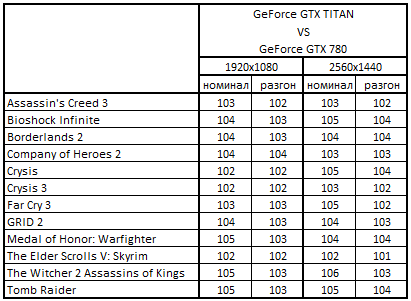 Сводная таблица производительности GeForce GTX Titan 6144 Мбайт и GeForce GTX 780 3072 Мбайт, где за 100% взят результат GeForce GTX 780 3072 Мбайт