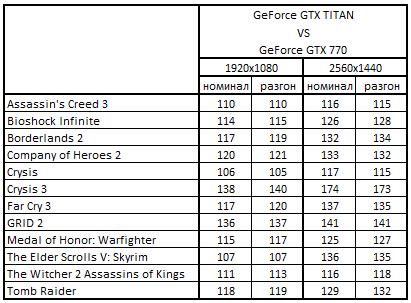 - GeForce GTX Titan 6144 Мбайт быстрее GeForce GTX 770 2048 Mбайт на 20-29% в 2 играх;