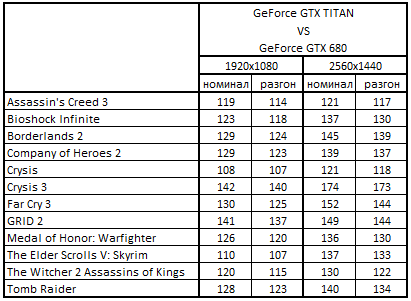 - GeForce GTX Titan 6144 Мбайт быстрее GeForce GTX 680 2048 Mбайт на 40-59% в 4 играх;