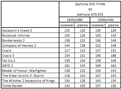 - GeForce GTX Titan 6144 Мбайт быстрее GeForce GTX 670 2048 Mбайт на 40-59% в 4 играх;