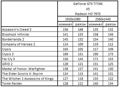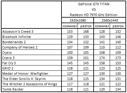 - GeForce GTX Titan 6144 Мбайт быстрее Radeon HD 7970 GHz Edition 3072 Мбайт на 40-59% в 3 играх;