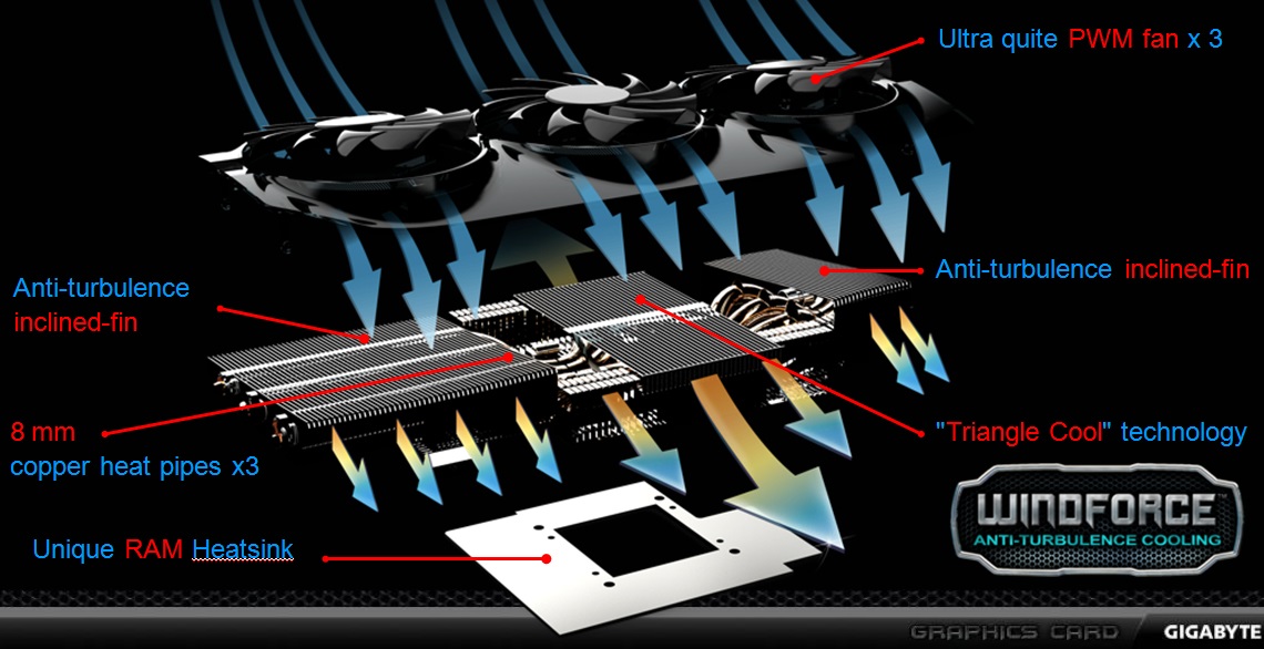 Официальный слайд компании наглядно демонстрирует схему распределения воздушных потоков под кожухом, а также основные преимущества системы охлаждения Gigabyte WindForce 3X.