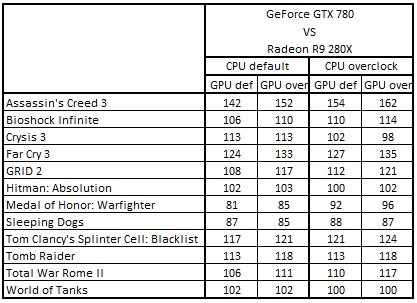 Сводная таблица производительности GeForce GTX 780 3072 Мбайт и Radeon R9 280X 3072 Мбайт, где за 100% взят результат Radeon R9 280X 3072 Мбайт