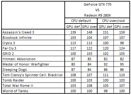 Сводная таблица производительности GeForce GTX 770 2048 Mбайт и Radeon R9 280X 3072 Мбайт, где за 100% взят результат Radeon R9 280X 3072 Мбайт