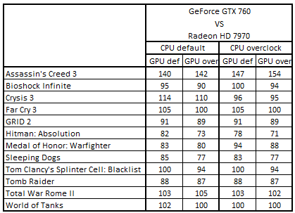 Сводная таблица производительности GeForce GTX 760 2048 Mбайт и Radeon HD 7970 3072 Мбайт, где за 100% взят результат Radeon HD 7970 3072 Мбайт