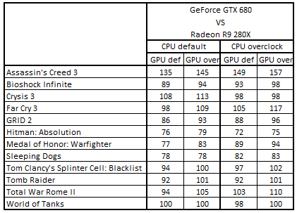 Сводная таблица производительности GeForce GTX 680 2048 Mбайт и Radeon R9 280X 3072 Мбайт, где за 100% взят результат Radeon R9 280X 3072 Мбайт