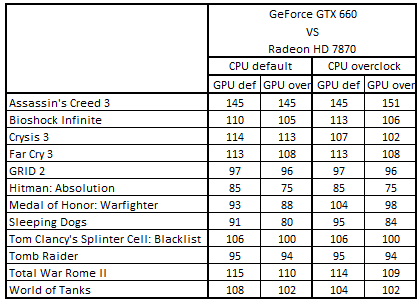 Сводная таблица производительности GeForce GTX 660 2048 Mбайт и Radeon HD 7870 2048 Мбайт, где за 100% взят результат Radeon HD 7870 2048 Мбайт