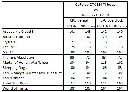 Сводная таблица производительности GeForce GTX 650 Ti Boost 2048 Mбайт и Radeon HD 7850 2048 Мбайт, где за 100% взят результат Radeon HD 7850 2048 Мбайт