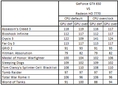 Сводная таблица производительности GeForce GTX 650 1024 Mбайт и Radeon HD 7770 1024 Мбайт, где за 100% взят результат Radeon HD 7770 1024 Мбайт
