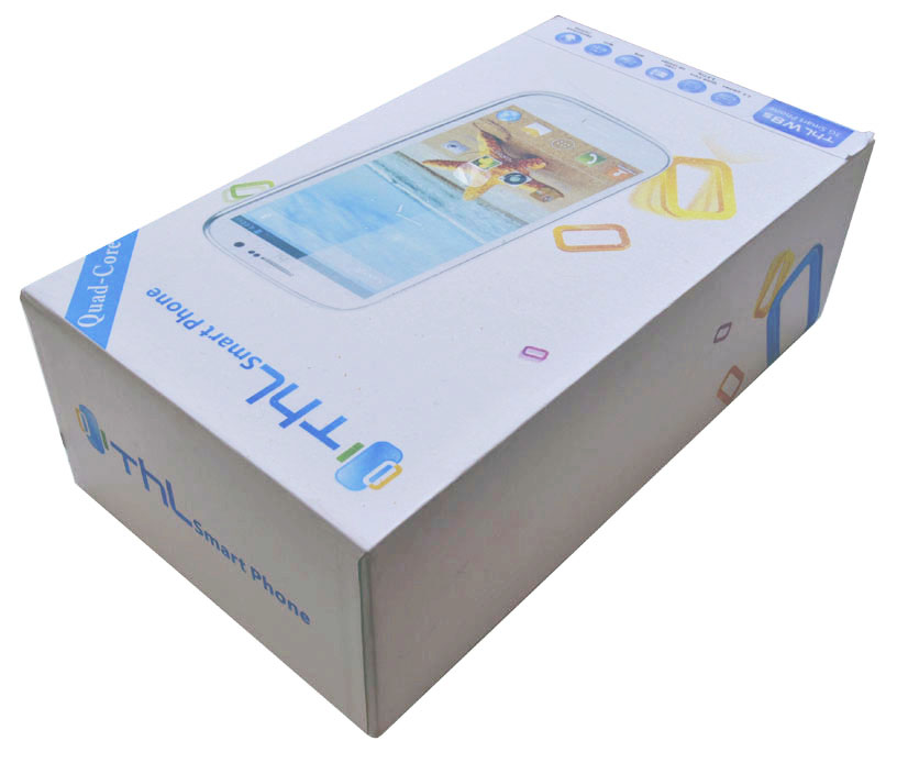 Смартфон ThL W8s упакован в стандартную прямоугольную коробку. Она достаточно крупная по размерам – 185 х 105 х 60 мм.