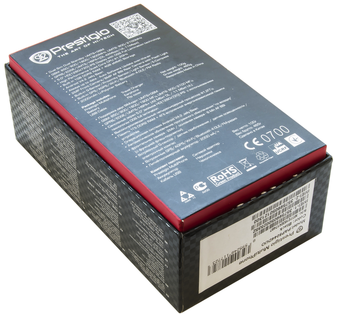 Смартфон Prestigio поставляется в коробке средних размеров (150 х 85 х 55 мм), состоящей из двух частей. Верхняя половина черная, а нижняя совмещает красный и черный цвет.