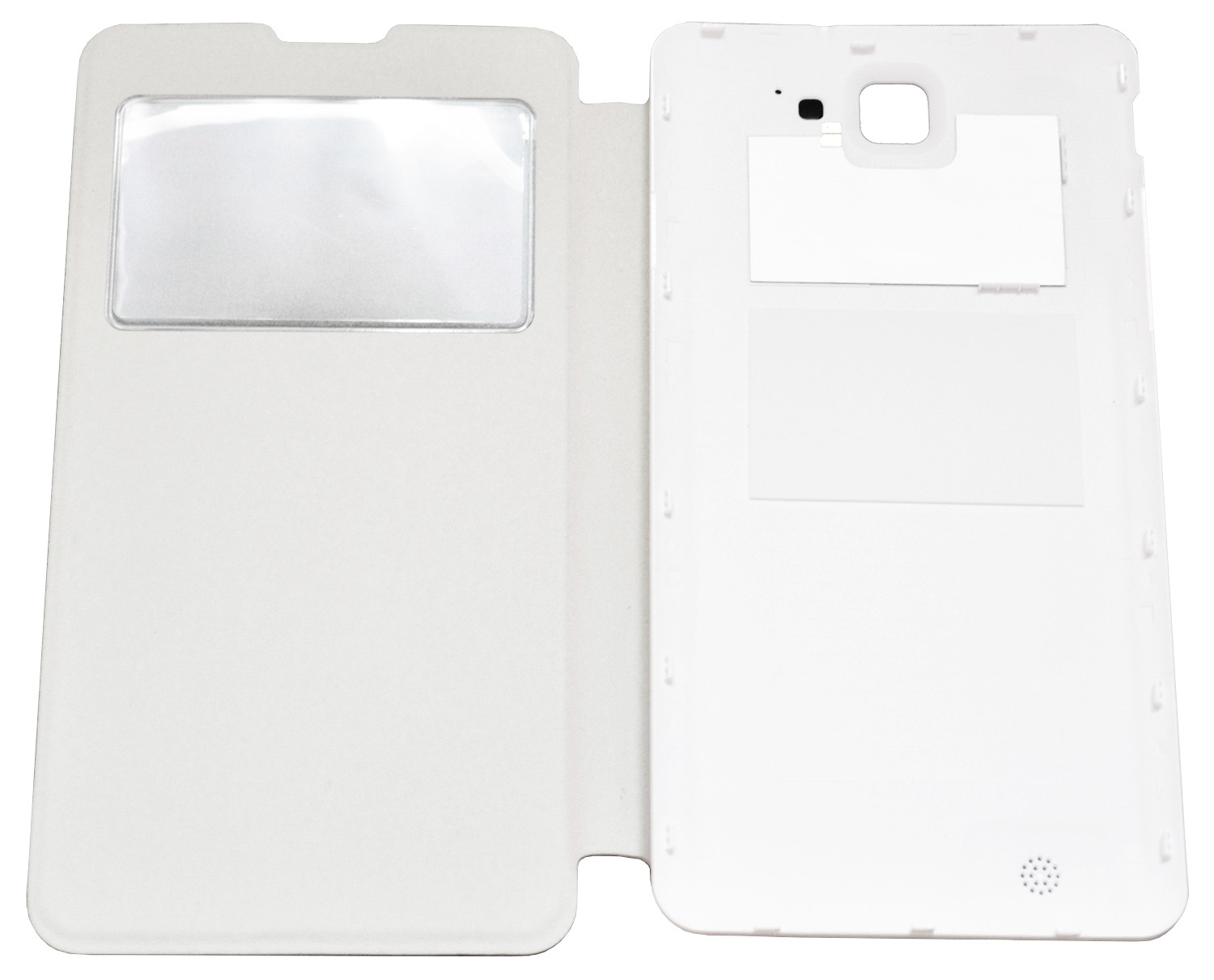 Чехол-книжка выполнен из кожзаменителя и прикреплен к дополнительной задней панели. Таким образом, получаются две панельки: одна обычная и вторая с чехлом. С внутренней стороны предусмотрена мягкая текстильная подложка, по своим качествам напоминающая замшу.