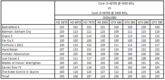 - Core i5-4670K @ 4500 МГц в паритете (+/-3%) с Core i5-4670K @ 3400 МГц в 10 играх.