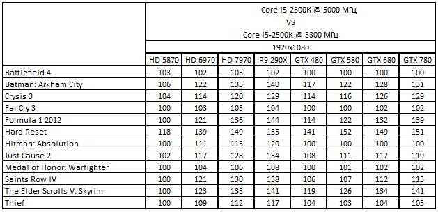 - Core i5-2500К @ 5000 МГц в паритете (+/-3%) с Core i5-2500К @ 3300 МГц в 1 игре.