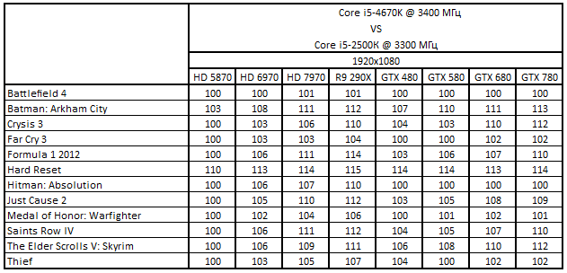 - Core i5-4670K @ 3400 МГц в паритете (+/-3%) с Core i5-2500К @ 3300 МГц в 6 играх.