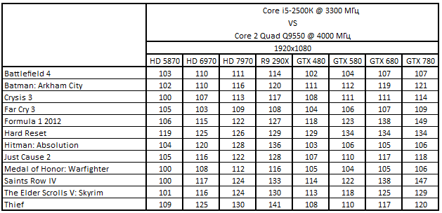 - Core i5-2500К @ 3300 МГц быстрее Core 2 Quad Q9550 @ 4000 МГц на 20-29% в 4 играх;