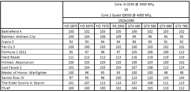 - Core i3-3240 @ 3400 МГц в паритете (+/-3%) с Core 2 Quad Q9550 @ 4000 МГц в 6 играх;