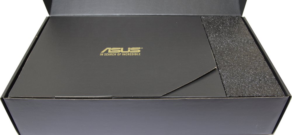 Пора заглянуть внутрь. Внутри цветной красивой оболочки скрывается черная невзрачная коробка. Сверху находится золотой тисненый логотип ASUS, а также надпись In search of incredible.