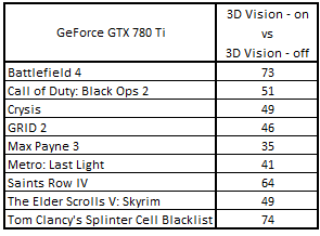 Сводная таблица производительности GeForce GTX 780 Ti 3072 Мбайт (3D Vision - включен) и GeForce GTX 780 Ti 3072 Мбайт (3D Vision - выключен), где за 100% взят результат GeForce GTX 780 Ti 3072 Мбайт (3D Vision - выключен)