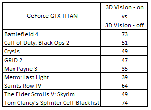 Сводная таблица производительности GeForce GTX Titan 6144 Мбайт (3D Vision - включен) и GeForce GTX Titan 6144 Мбайт (3D Vision - выключен), где за 100% взят результат GeForce GTX Titan 6144 Мбайт (3D Vision - выключен)
