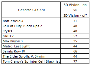 Сводная таблица производительности GeForce GTX 770 2048 Mбайт (3D Vision - включен) и GeForce GTX 770 2048 Mбайт (3D Vision - выключен), где за 100% взят результат GeForce GTX 770 2048 Mбайт (3D Vision - выключен)