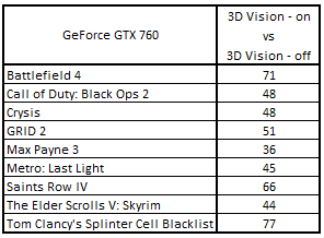 Сводная таблица производительности GeForce GTX 760 2048 Mбайт (3D Vision - включен) и GeForce GTX 760 2048 Mбайт (3D Vision - выключен), где за 100% взят результат GeForce GTX 760 2048 Mбайт (3D Vision - выключен)