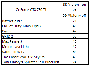 Сводная таблица производительности GeForce GTX 750 Ti 2048 Mбайт (3D Vision - включен) и GeForce GTX 750 Ti 2048 Mбайт (3D Vision - выключен), где за 100% взят результат GeForce GTX 750 Ti 2048 Mбайт (3D Vision - выключен)