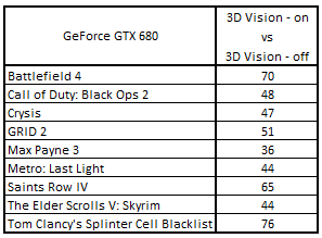 Сводная таблица производительности GeForce GTX 680 2048 Mбайт (3D Vision - включен) и GeForce GTX 680 2048 Mбайт (3D Vision - выключен), где за 100% взят результат GeForce GTX 680 2048 Mбайт (3D Vision - выключен)