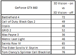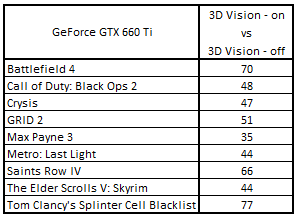 Сводная таблица производительности GeForce GTX 660 2048 Mбайт (3D Vision - включен) и GeForce GTX 660 2048 Mбайт (3D Vision - выключен), где за 100% взят результат GeForce GTX 660 2048 Mбайт (3D Vision - выключен)