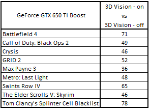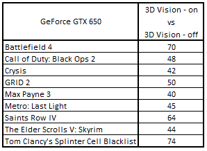 Сводная таблица производительности GeForce GTX 650 Ti 1024 Mбайт (3D Vision - включен) и GeForce GTX 650 Ti 1024 Mбайт (3D Vision - выключен), где за 100% взят результат GeForce GTX 650 Ti 1024 Mбайт (3D Vision - выключен)