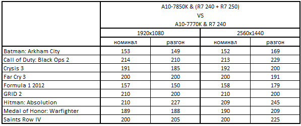 Сводная таблица производительности A10-7850K & (R7 240 + R7 250) и A10-7850K & R7 250, где за 100% взят результат A10-7850K & R7 250