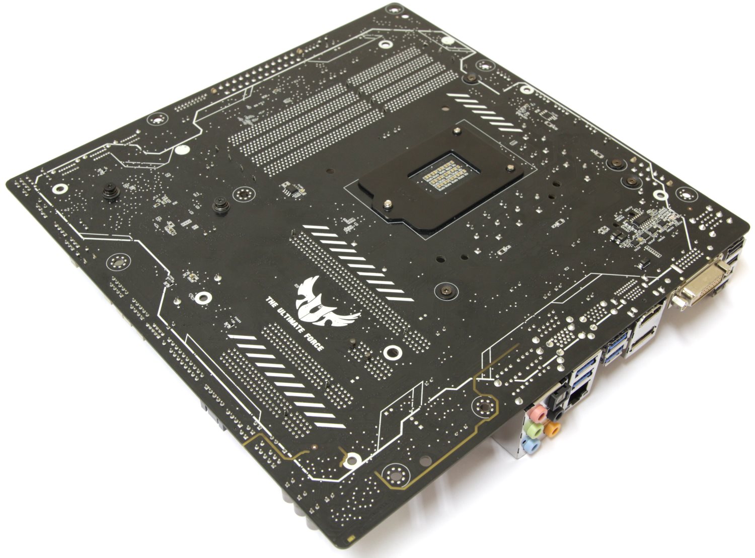 Действительно, внешний вид соответствует любому устройству из линейки TUF. это видно не только спереди, но и с обратной стороны. Дело не только в символике, но и в особой цветовой палитре разъемов и радиаторов. Габариты устройства стандартны для формата mATX и составляют 244 х 244 мм.