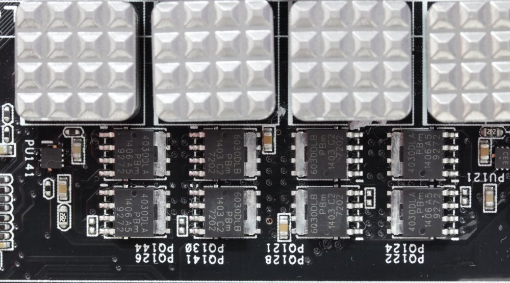 Верхняя поверхность катушек индуктивности выполнена в виде бугорков. Возможно такой дизайн позволяет лучше отводить тепло, поскольку увеличивается площадь. Транзисторы здесь используются самые обыкновенные, типа Low Rds(on).