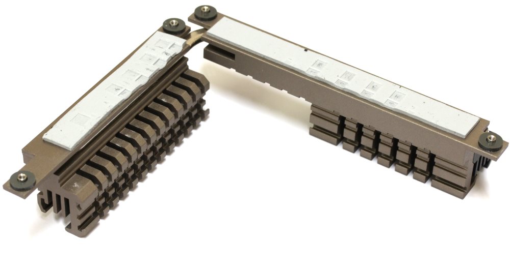 Оба устройства изготовлены из алюминиевого сплава и окрашены в бежевый цвет. На одном из них есть черная вставка. По сути это вторая половина одного радиатора, которая крепится к ней при помощи двух винтов. Профиль обоих устройств сложный, а оребрение достаточно развитое. Кроме этого их поверхность шероховатая, что теоретически также увеличивает площадь поверхности для лучшего теплообмена. Крепление осуществляется с обратной стороны при помощи четырех винтов жестко к печатной плате. Во избежание ее повреждений предусмотрены специальные пластиковые шайбы. В качестве термоинтерфейса используется серая терморезинка толщиной около 1 мм. Она очень хрупкая и поэтому ее легко можно повредить при демонтаже системы охлаждения.