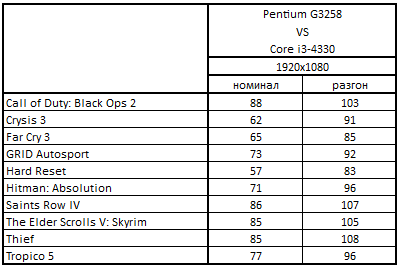 Сводная таблица производительности Pentium G3258 и Core i3-4330, где за 100% взят результат Core i3-4330